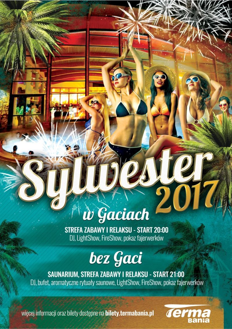 Sylwester bez gaci to impreza zamknięta w kameralnym gronie. Idealna propozycja dla miłośników saunowania. W programie: zabawa z DJ-em, aromatyczne rytuały saunowe, kolacja w formie bufetu, LightShow (Saunarium) i FireShow (Saunarium), lampka szampana o północy, pokaz pirotechniczny. Bilet w opcji bez gaci pozwala na korzystanie ze wszystkich stref obiektu.
