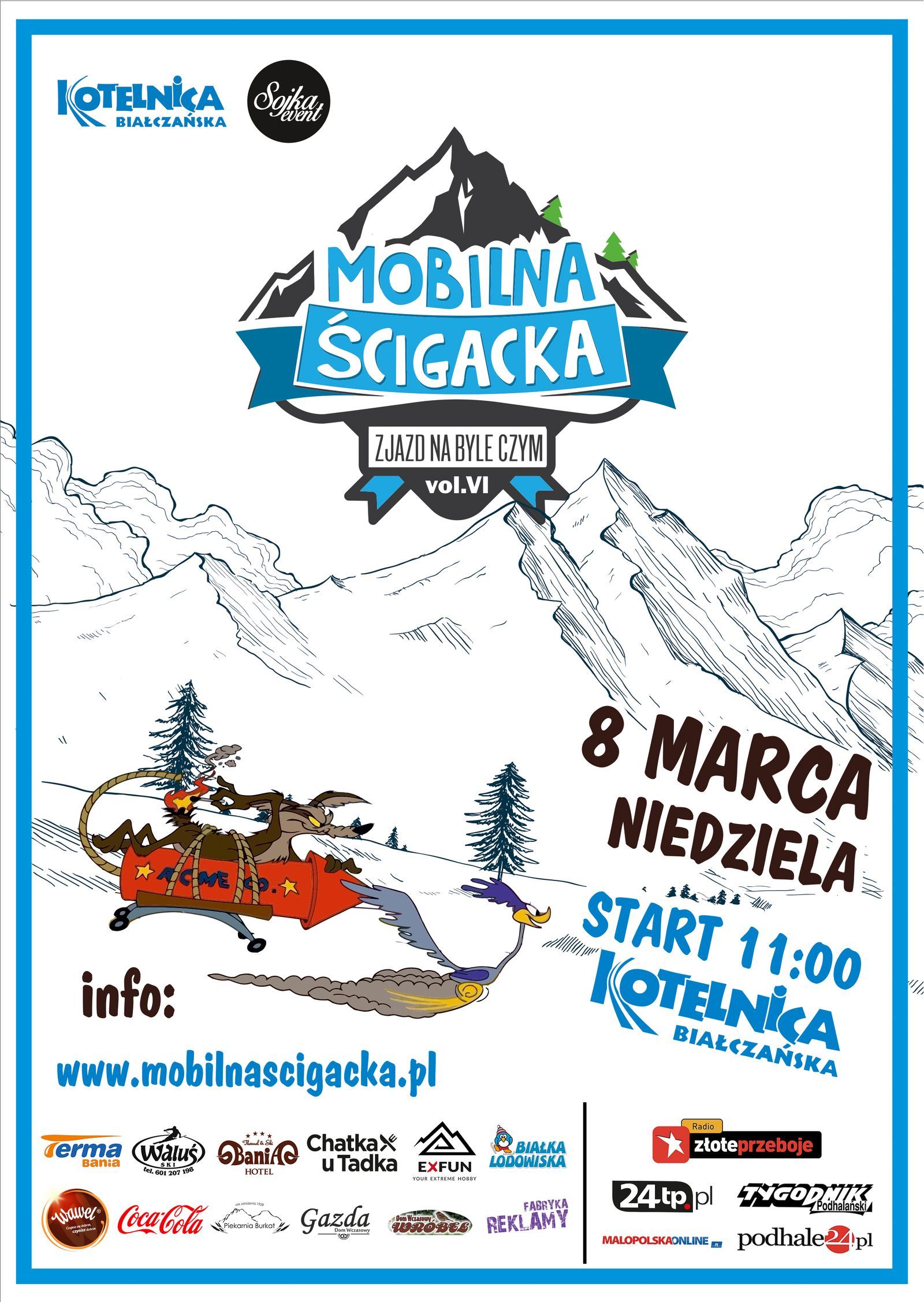 Mobilna Ścigacka to największa tego typu impreza w Polsce, organizowana na stoku Ośrodka Narciarskiego Kotelnica Białczańska. Nasze motto to dobra zabawa, miło spędzony czas, duża dawka humoru i pozytywnej energii. Każdy może wykazać się inwencją twórczą w stworzeniu swojego unikatowego pojazdu, na którym zjedzie z pompą ze specjalnie przygotowanej trasy.