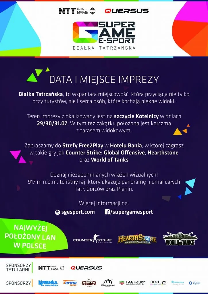 Co tak naprawdę przemawia za tym, by dotrzeć właśnie w to miejsce i jakie atrakcje czekają na wszystkich gości? Z całej Imprezy będzie prowadzona transmisja na żywo nic nie umknie Twojej uwadze. Kolejka linowa, która przeniesie Cię do najwyżej położonego ośrodka narciarskiego w Polsce. Zjazd poprzez specjalny pojazd po Stoku Kotelnicy, na dolą strefę ESportu Główne Turnieje w takie gry jak Counter Strike Global Offensive, World of Tanks , HearthStone To pierwsza taka Impreza w Polsce, jak i na świecie. Specyficzne i zarazem urokliwe miejsce, to idealny „produkt” do zrelaksowania się i posmakowania akcentu e-sportowego.